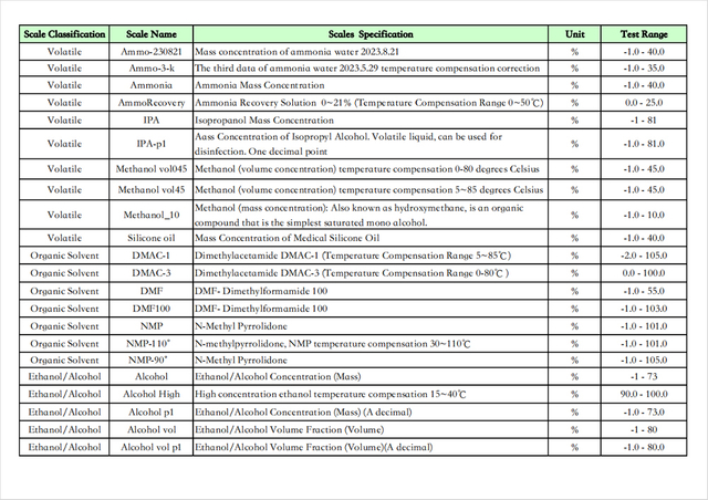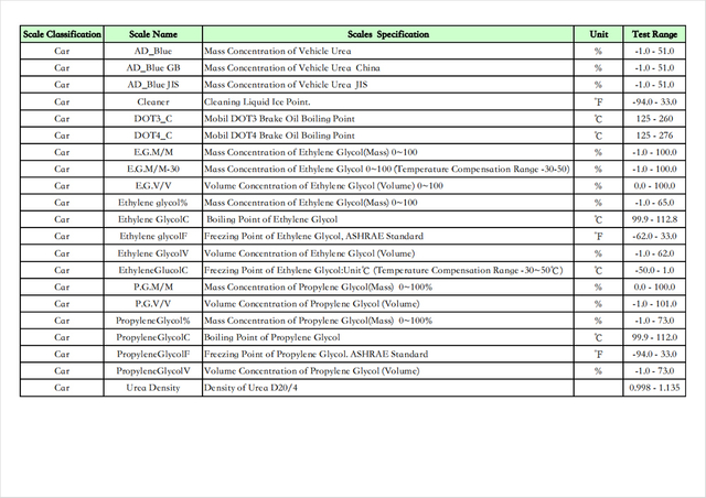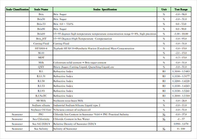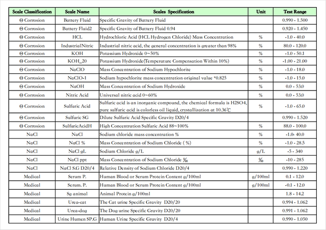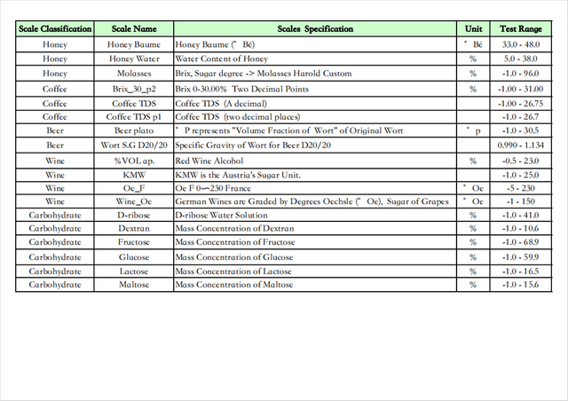 Esta aplicación puede calcular y medir una variedad de tipos de líquidos y sus parámetros, tales como: contenido de azúcar de jugos o bebidas de frutas, contenido de pomo de miel/agua, concentración de urea vehicular, gravedad específica de la orina humana, contenido de alcohol de vino blanco, alcohol de vino tinto. contenido/dulzura, TDS del soluto sólido del café, etc.
